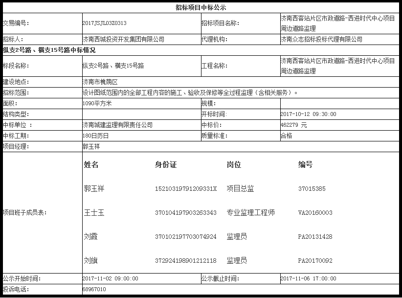 濟南西客站片區市政道路-西進時代中心項目周邊道路監理中標公示