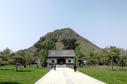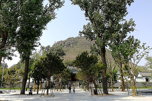 在綠地廣場面向一宮門,右側可以看到臥牛山的全貌,正面對視華山。兩側綠地每側精選了7棵造型油松,因為華陽宮道家文化的元素多些,此處也有北斗七星的意境。二是采用了借景、點景、框景的園林手法,借一宮門為背景,點造型松為景物,框出清晰的山體輪廓的畫面。