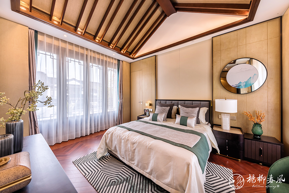 另一套大戶型樣板房采用新中式風(fēng)格,以儒家思想為依托,通過(guò)大理石、金屬銅、木材的有機(jī)結(jié)合,體現(xiàn)主人的穩(wěn)重、尊貴和優(yōu)雅。約110㎡的大面積庭院,演繹著四季不落幕的錦繡風(fēng)光;挑高約5.7米的地下空間,讓格調(diào)生活隨心定制。整套樣板房抒寫(xiě)著文雅靈動(dòng)的東方氣韻,展現(xiàn)了“中正和雅”的國(guó)風(fēng)意境。