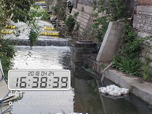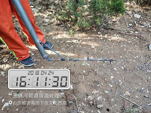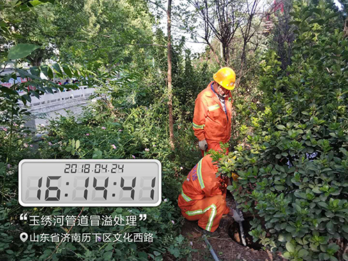 2018年4月24日濟南市政公用資產管理運營有限公司接到濟南市排水管理服務中心通知,在玉繡河下游發現一處檢查井冒溢,污水冒溢至玉繡河內直接造成河道污染,接到通知后,公司立即安排應急搶險小組前往現場,經過現場排查該管段位于玉繡河河床內,不屬于我公司管轄范圍,按照市城鄉水務局“2018清網行動”精神指示,本著有險情先搶險的原則,公司對該冒溢點立即進行搶修,保證管網正常運行。