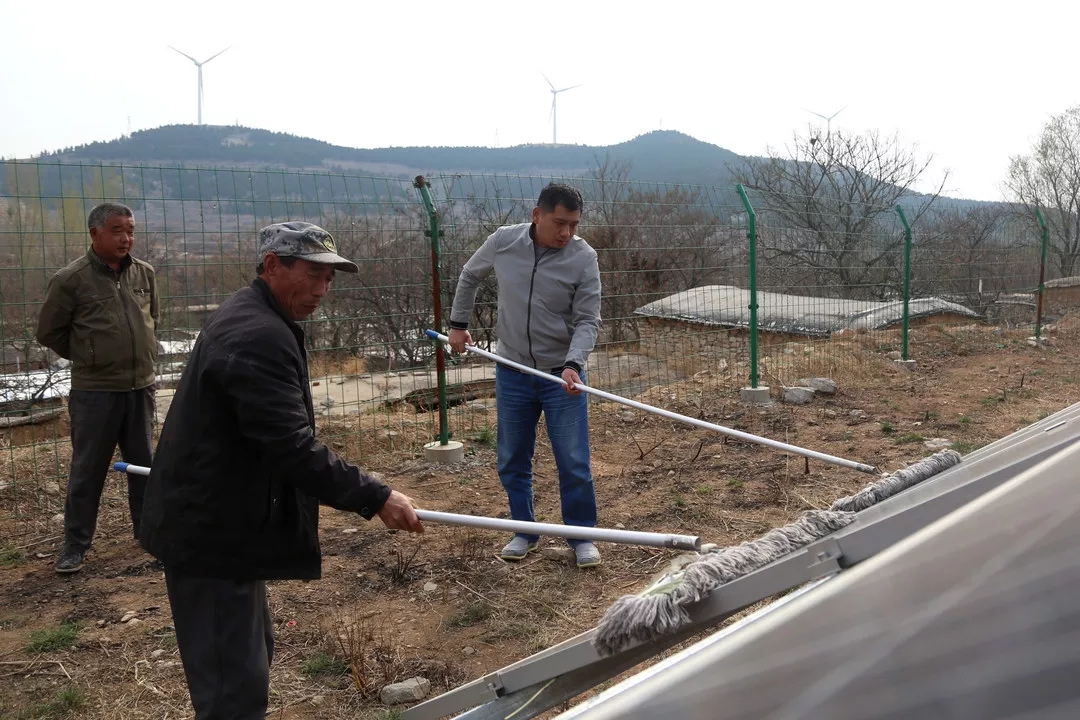 13:30沿著陡峭山路晚上走,王棟棟來到了村里的光伏發電項目,“有兩塊光伏板壞掉了,要及時向扶貧辦報修調換,不然會影響發電量”。王棟棟叮囑管理人員。報修完之后,王棟棟和維護人員一起對光伏板進行擦洗維護。
