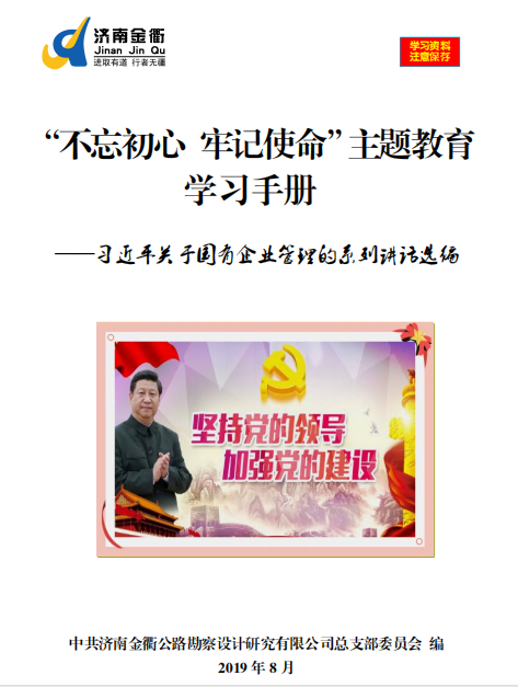 為扎實推進“不忘初心、牢記使命”主題教育深入開展,不斷總結提煉工作成果,切實抓好主題教育與本領域工作的深度融合,更好的促進黨員干部學習的自覺性和主動性,8月份,濟南金衢公路勘察設計研究有限公司編印了以“習近平總書記視察山東重要講話指示精神”、“關于國有企業改革管理系列講話”為主要內容的學習手冊,作為公司主題教育學習輔導讀本,進一步豐富了學習載體。