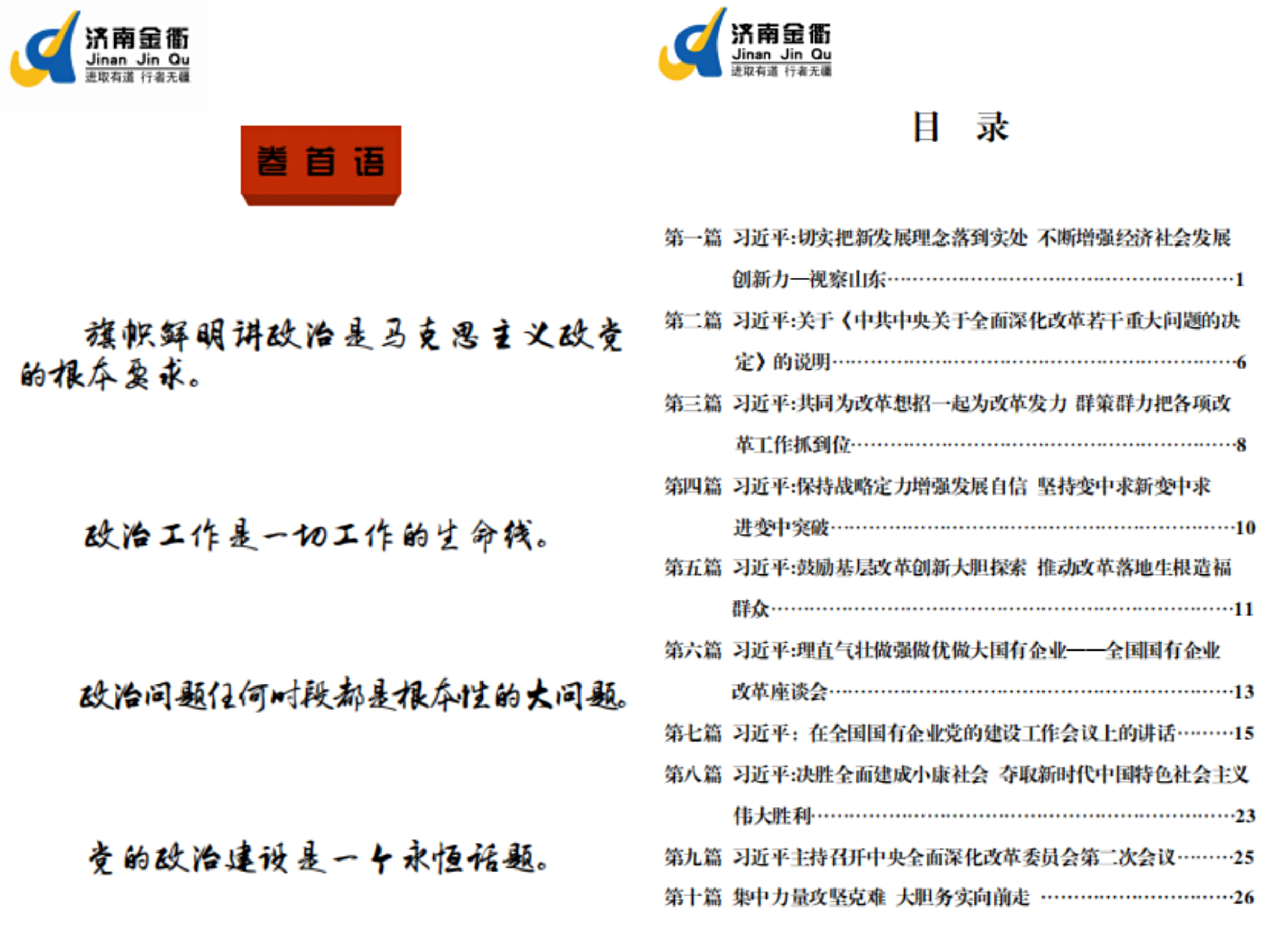 該學習手冊上共載編十篇,主要包含習總書記視察山東重要講話和國有企業改革兩個部分,系統選編了習總書記一系列重要講話和論述摘要,集中摘錄了與之相關的現場照片和工作素材,且小巧方便、利于攜帶,極大地方便了黨員干部隨時隨地可學、隨手隨處可看,為主題教育開展提供了有力參考,是一本集學習與宣講功能的工具書。