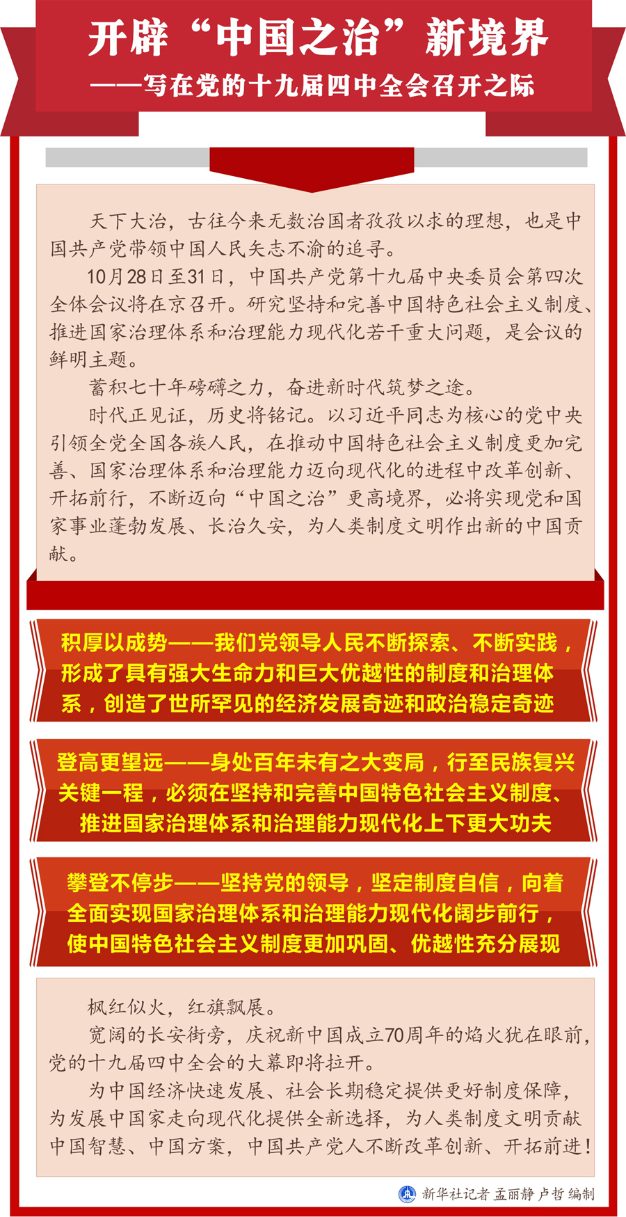 寬闊的長安街旁,慶祝新中國成立70周年的焰火猶在眼前,黨的十九屆四中全會的大幕即將拉開。