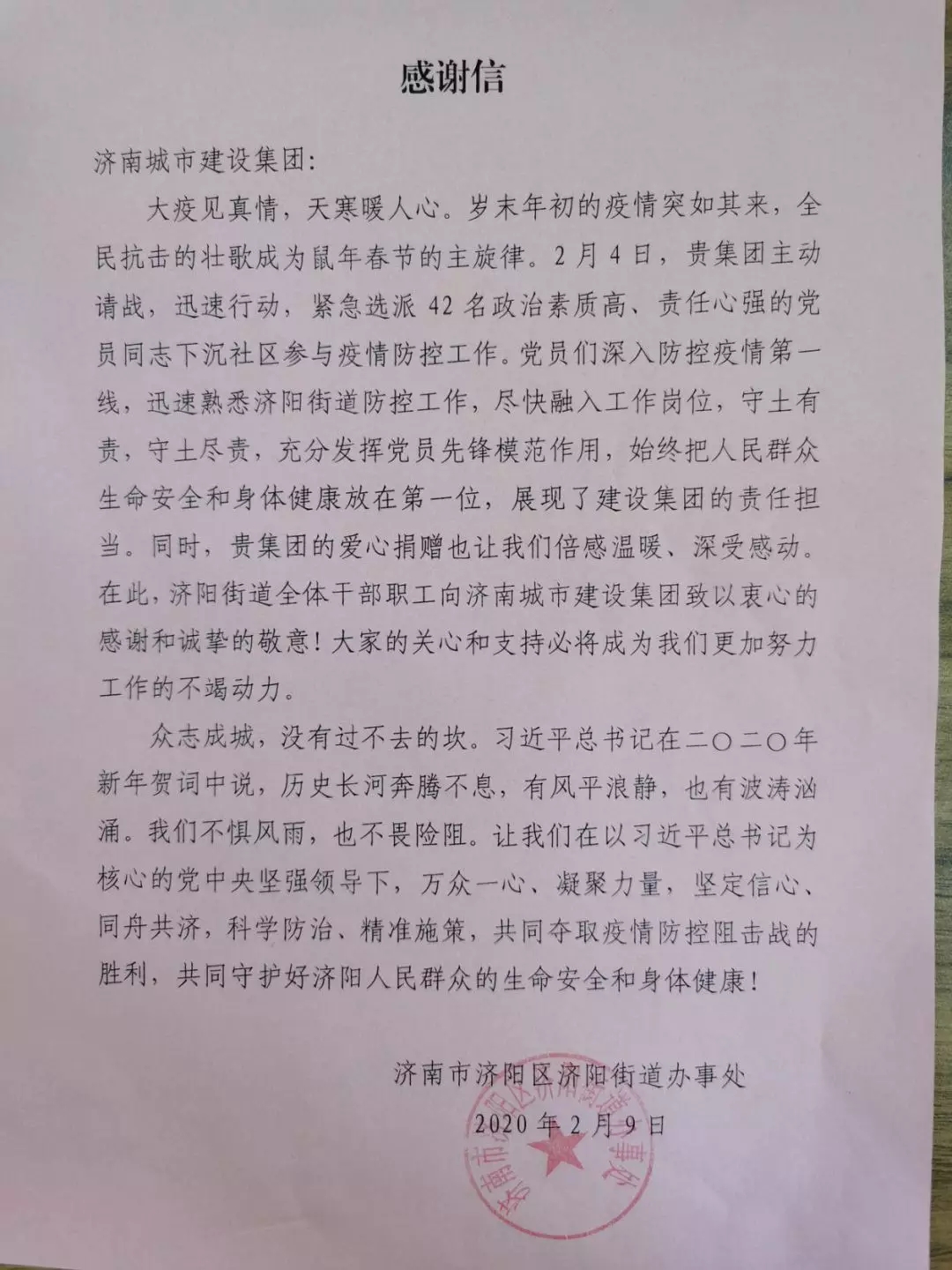 濟(jì)陽街道辦事處專門給集團(tuán)寫了感謝信,濟(jì)陽街道康瑞社區(qū)與雅居園物業(yè)管理有限公司還向呂仁鎮(zhèn)、齊鵬飛兩名黨員同志贈(zèng)送了寫有“抗擊疫情勇?lián)?dāng),志愿服務(wù)爭先鋒”的錦旗。