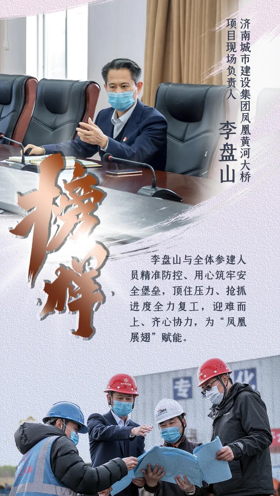 陽春三月,兩岸新綠。鳳凰黃河大橋施工現場,各施工區域熱火朝天、作業正忙。自項目全面復工以來,1000多名工人日夜奮戰一線,在做好疫情防控工作基礎上,項目建設各項工作全速推進。作為濟南城市建設集團鳳凰黃河大橋項目現場負責人,李盤山與全體參建人員精準防控、用心筑牢安全堡壘,頂住壓力、搶抓進度全力復工,迎難而上、齊心協力,為“鳳凰展翅”賦能。
