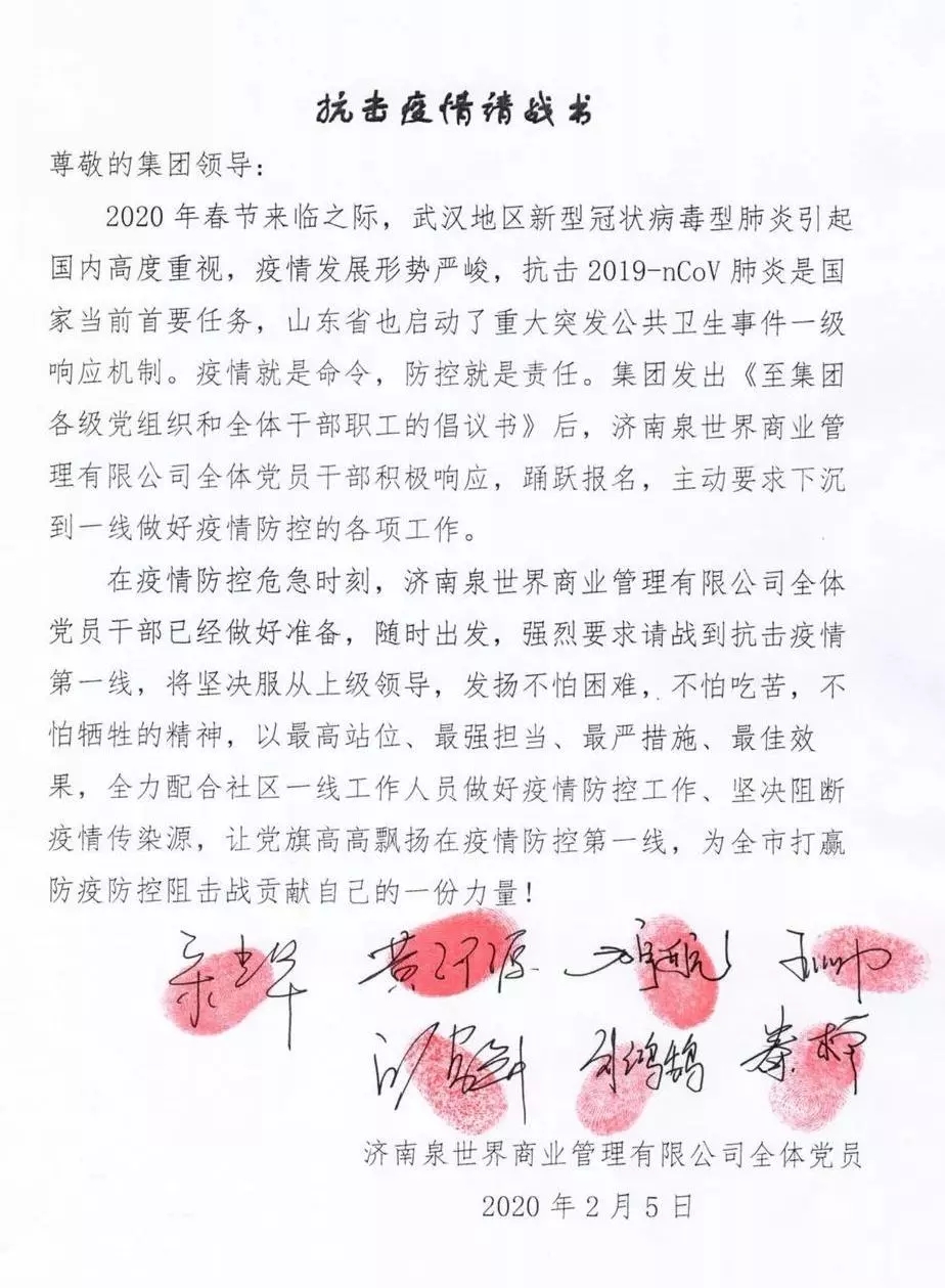 在接到集團通知后,泉世界商管公司高度重視,立刻組織公司黨員開會學習集團指示,部署工作任務。印象濟南·泉世界執行董事兼總經理宋光華率先垂范帶頭報名,公司全體黨員干部第一時間積極響應,踴躍報名,主動要求下沉到一線做好疫情防控的各項工作,以實際行動守初心、擔使命,為打贏疫情防控阻擊戰作出新的更大貢獻!最終,公司7名黨員干部全部報名請求到抗擊疫情一線工作,并在《抗擊疫情請戰書》上簽字按手印。