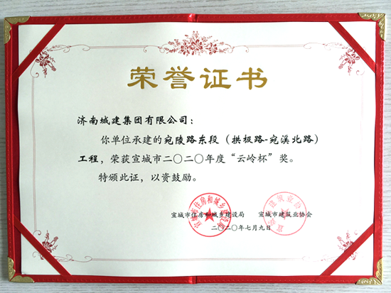 近日,由集團所屬濟南城建集團有限公司承建的宣城市水陽江大道閉合段北段工程PPP項目、宛陵東路(拱極路—宛溪北路)工程榮獲宣城市2020年度“云嶺杯”獎。