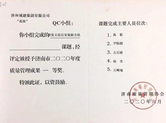 經濟南質量管理協會專家組評審,濟南城建集團有限公司報送的QC成果榮獲一等獎5項、二等獎4項,濟南城建集團有限公司的城市隧道項目班組、701項目班組、盾構施工管理班組、804項目班組等共有7個班組榮獲“2020年度濟南市質量信得過班組”稱號。另外,張勝安等3名員工獲得“2020年度濟南市優秀質量管理先進工作者”稱號。