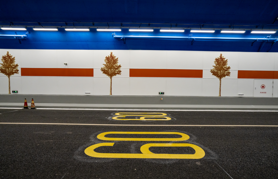 保持隧道主體工程結構不變,通過增加裝飾,實現整體設計提升。隧道南北出口聲屏障以“歲歲九曲彎”和“歲歲安瀾”為設計主題,以中國傳統裝飾紋樣呈現,夜晚還將呈現“日出黃河”的燈光效果。添加“流動”與“水紋”的造型體現了黃河穿越之美,在隧道內采用3D打印貼膜工藝繪制白楊樹(寓意堅韌、表達力求上進的精神),以緩解駕駛員視覺疲勞。同時以黃河星空為題,中間段頂部弧線的燈光表現黃河穿越之感,暖色照明設計表現,感受黃河星空光線流動之美。
