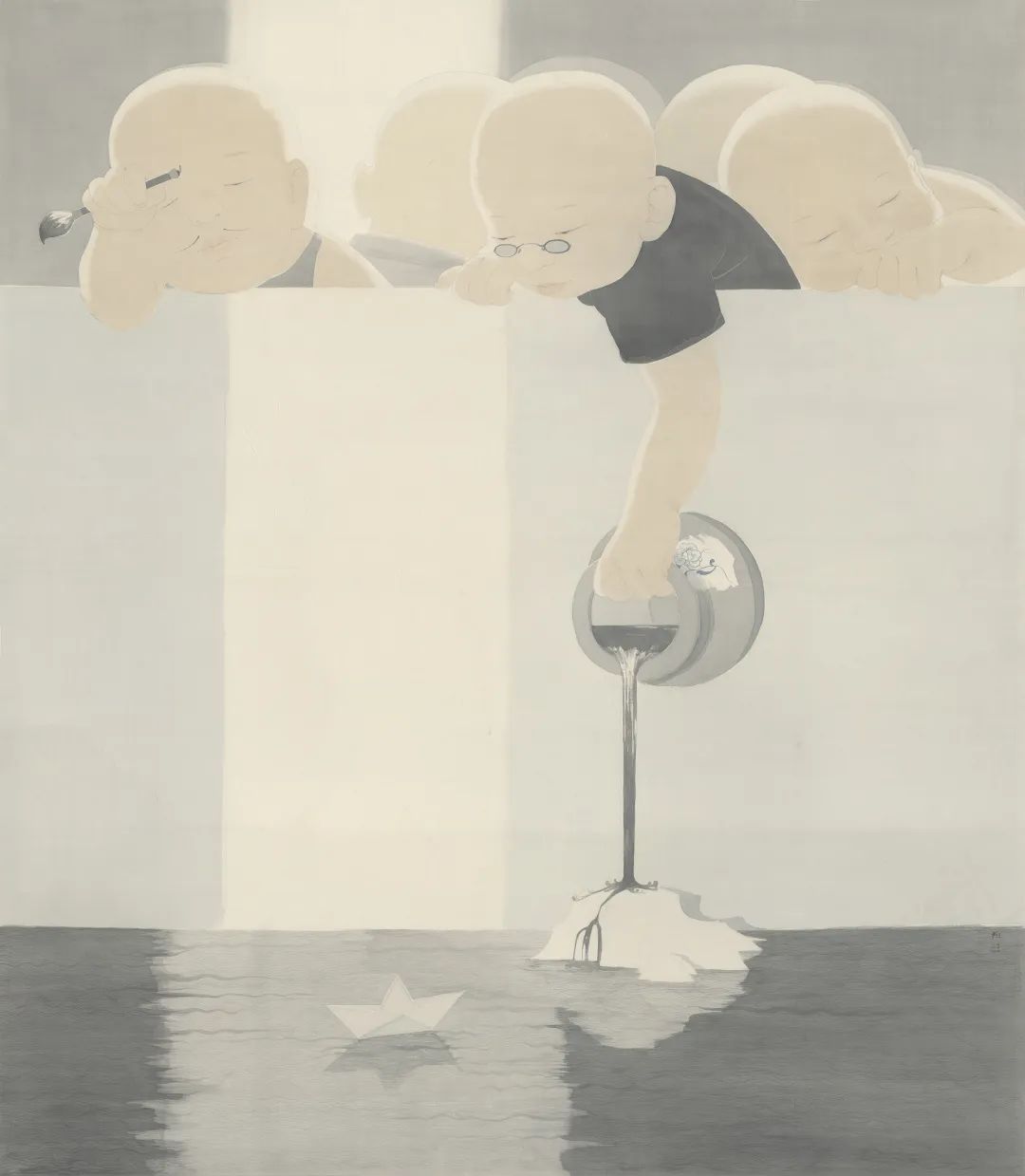 作品《夏》以泉文化為題,畫(huà)中的五個(gè)孩童,以孩童的視角展示生命里純粹的感受。畫(huà)面中,泉娃預(yù)示著生命之始,泉水預(yù)示著生命之源。同時(shí),毛筆與墨汁展示著傳統(tǒng)和文化,紙船映射著遠(yuǎn)方與航向,光綻放著溫暖與希望。畫(huà)中調(diào)子暖灰色,畫(huà)面祥和安寧,作品從中也映射出,在日新月異的泉城濟(jì)南,在人們的不斷改革、創(chuàng)新和發(fā)展下,孩子們才能夠有了更加安定祥和的空間與環(huán)境。