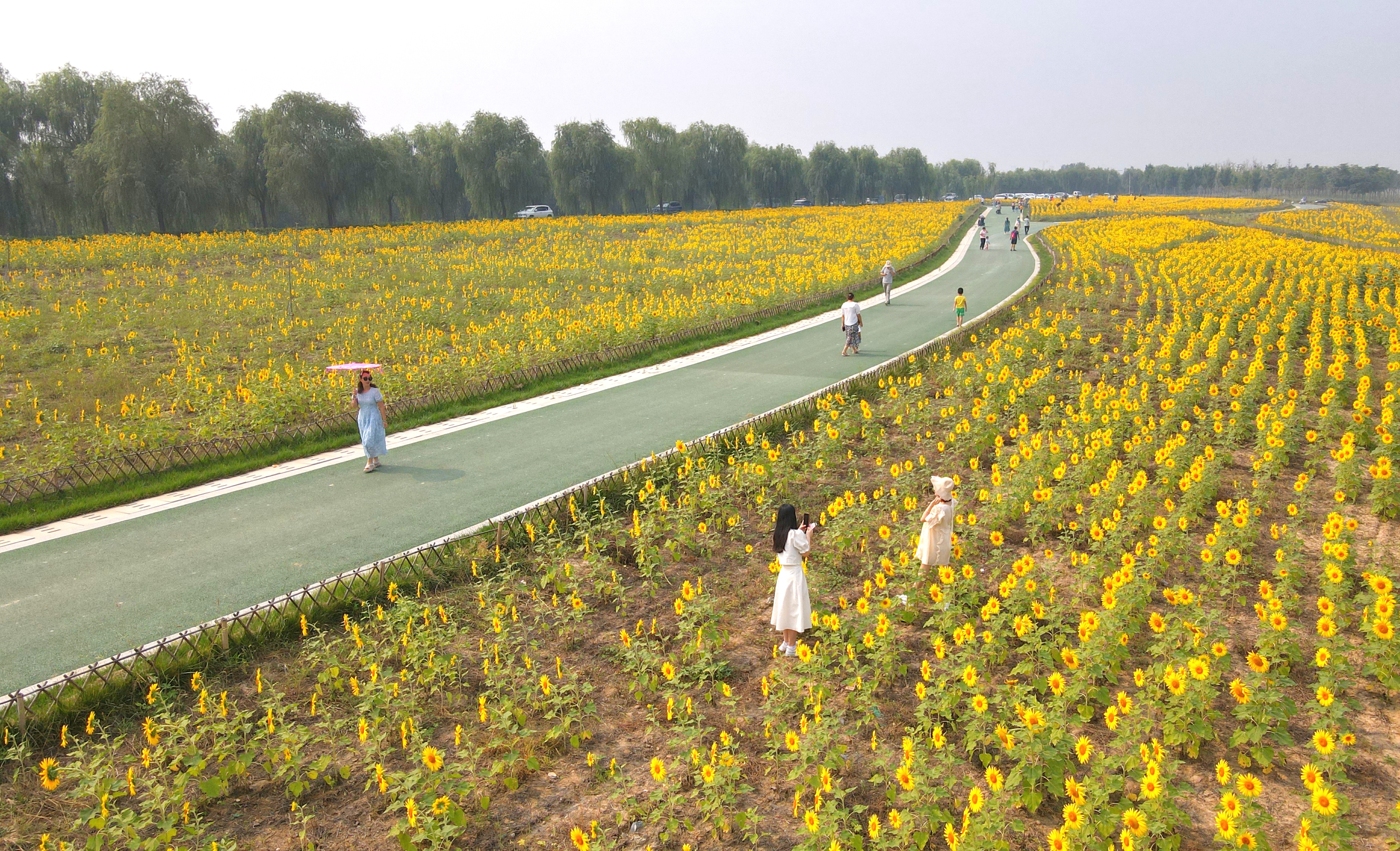 起步區(qū)黃河生態(tài)景觀風(fēng)貌帶示范區(qū)的鵲華秋色園內(nèi),上萬平米的葵花競相開放,橙黃的花蕊,金黃的花瓣,碩大的花盤,在翠綠枝葉的映襯下顯得分外明麗動人。不少市民慕名前來,漫步花海、游玩“打卡”。