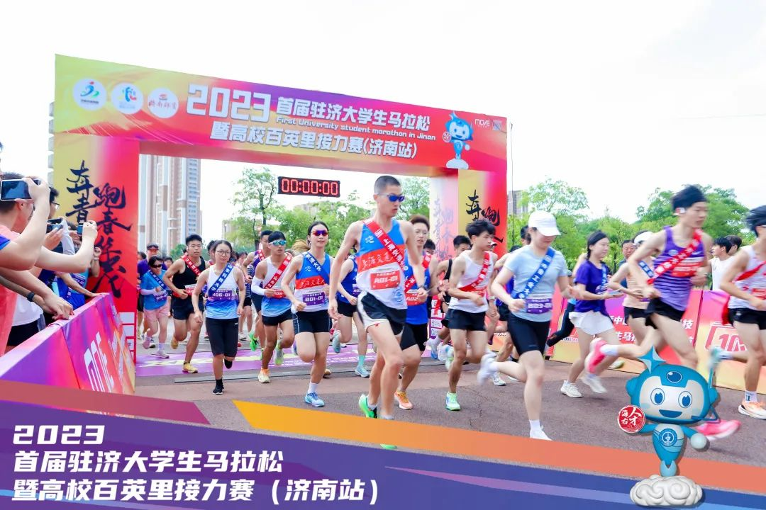 隨著發令槍響,參賽選手們分成東西兩隊踏上人字形主題跑道,進行了“人字形主題熱身跑”。大約500米后,選手們抵達天圓廣場集結區,首屆駐濟大學生馬拉松迷你項目和高校百英里接力賽全馬接力項目激烈開賽。