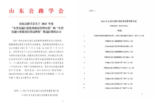 濟(jì)南質(zhì)量管理協(xié)會(huì)發(fā)布《關(guān)于公布濟(jì)南市 2023 年度群眾性質(zhì)量管理活動(dòng)優(yōu)秀成果、質(zhì)量信得過班組的通知》。金曰公司“路安”QC小組的成果“提高城市高架橋防撞墻面層維修一次合格率”榮評(píng)“濟(jì)南市2023年度群眾性質(zhì)量管理活動(dòng)QC成果特等獎(jiǎng)”。