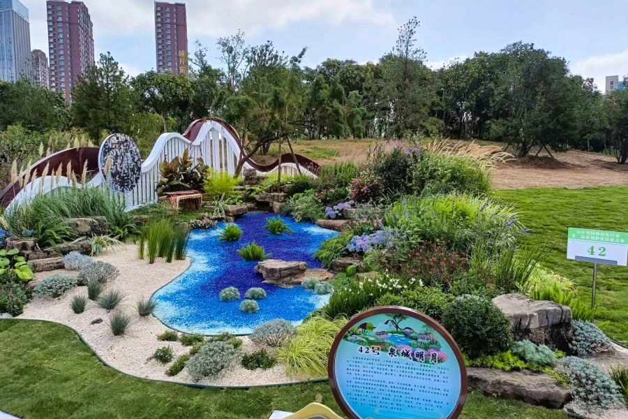 自接到參賽任務(wù)后,城建集團(tuán)公司高度重視,精心組織,選派業(yè)務(wù)技能扎實的專業(yè)技術(shù)人員參賽,將此次競賽作為展示集團(tuán)形象的重要平臺。比賽過程中,參賽隊員積極克服天氣、選材、地形高差、異地施工等困難,在地形塑造、景觀施工、苗木栽植等環(huán)節(jié)中精益求精,以“泉城明月”作為參賽主題,融入節(jié)約環(huán)保、生態(tài)自然的理念,創(chuàng)新使用深藍(lán)、淺藍(lán)、白色三色琉璃石子漸變仿真水景,與花序、山景共同打造“一城山色半城湖”,再現(xiàn)“泉城月明”意境。