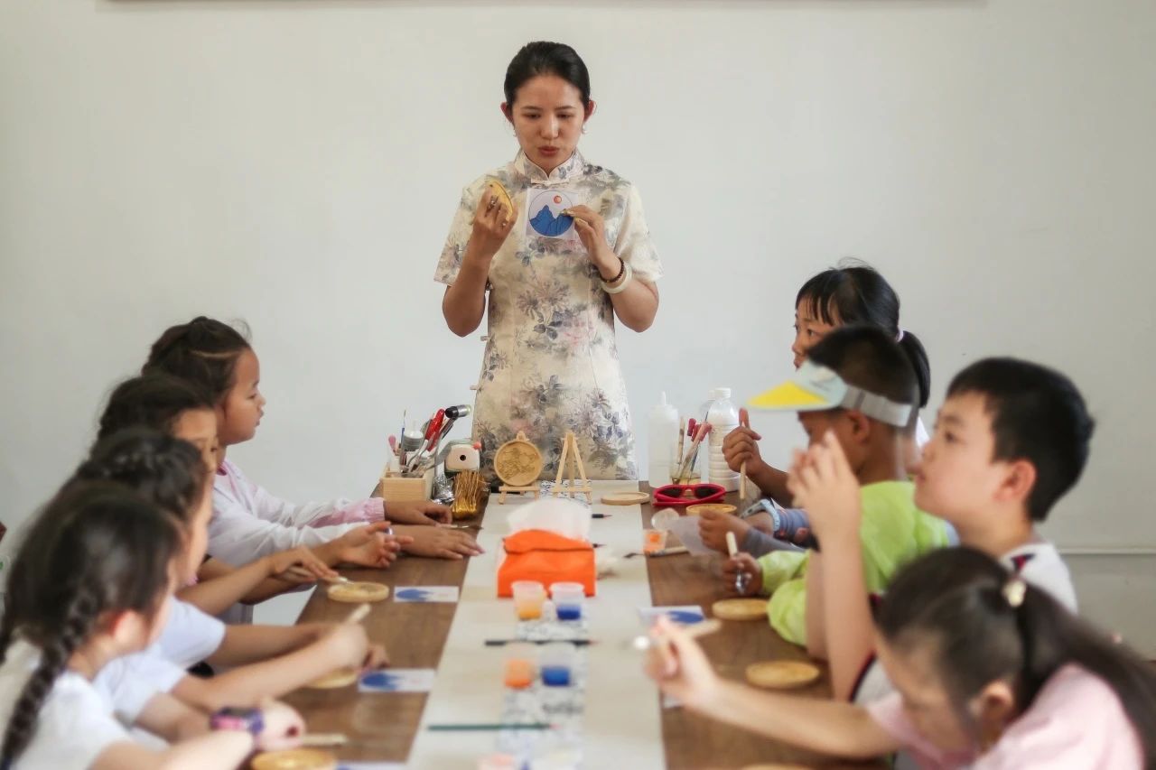 老師帶領(lǐng)小朋友現(xiàn)場體驗掐絲琺瑯和水拓團(tuán)扇非遺技藝。孩子們認(rèn)真地完成掐絲、點藍(lán)等步驟,用顏料勾勒出美麗的圖案,不僅體驗了手工制作的樂趣,也對非遺技藝有了更直觀的認(rèn)識。