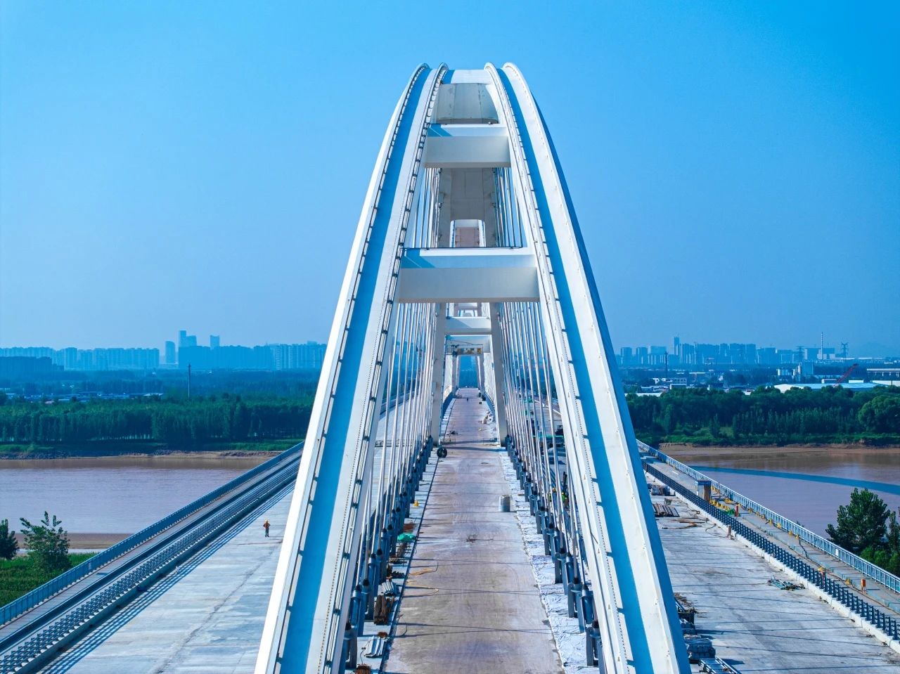 齊魯黃河大橋主橋?yàn)?ldquo;公軌同層,軌道居中”,雙向八車道一級(jí)公路標(biāo)準(zhǔn),主橋鋼箱梁寬60.7米,是世界最大跨度、最寬鋼箱梁、最高應(yīng)力幅拉索的下承式組合梁網(wǎng)狀系桿拱橋。同時(shí),濟(jì)南黃河齊魯大橋跨黃河特大橋?qū)⒐贰④壍澜煌ā⑷诵械篮头菣C(jī)動(dòng)車道同層共建,實(shí)現(xiàn)了橋位資源和土地的集約化利用,減少了對(duì)河道和環(huán)境的干擾,降低了工程成本。