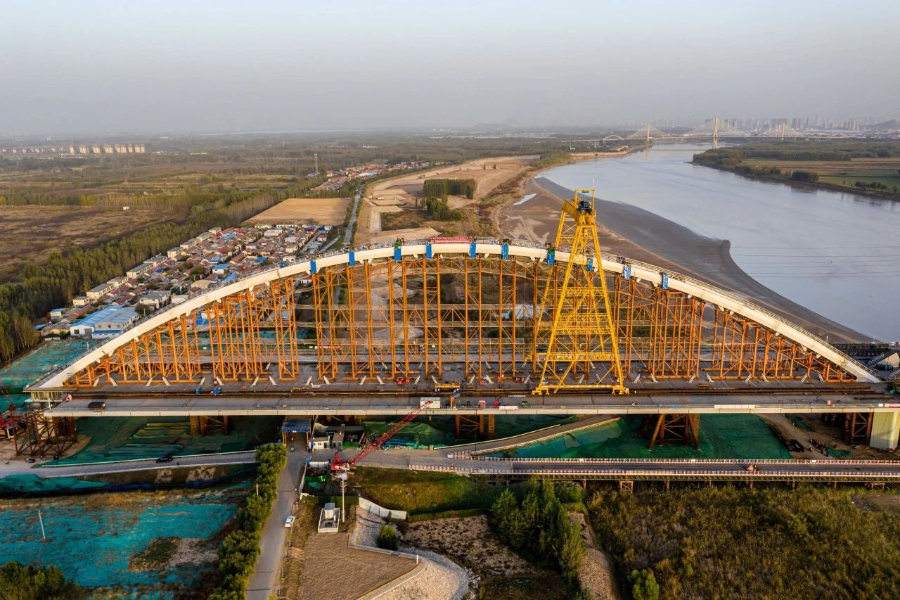 在420米跨拱肋提升中,施工單位中交二公局提出“梁拱分離頂推、先梁后拱、梁上架拱工藝”,創(chuàng)新研發(fā)“無(wú)合龍段整體提升合龍工藝”進(jìn)行主跨拱肋架設(shè),整體提升重量6800T,提升段跨徑300m,提升高度25.5m,為橋梁領(lǐng)域首次研發(fā)并成功應(yīng)用,被譽(yù)為“黃河第一拱、世界第一吊”。