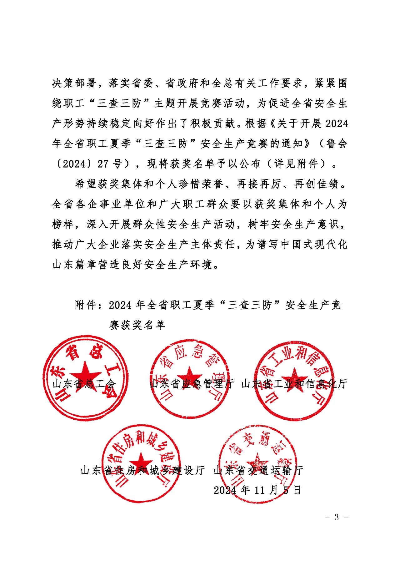 近日,山東省總工會、山東省應急管理廳、山東省工業和信息化廳、山東省住房和城鄉建設廳、山東省交通運輸廳聯合發布了《關于公布2024年全省職工夏季“三查三防”安全生產競賽獲獎情況的通知》,濟南城市建設集團質量安全部積極響應上級主管部門的號召,按照集團黨委的科學部署,全面而深入地開展了各項安全專題活動,榮獲“三查三防”安全生產競賽優勝班組榮譽稱號。