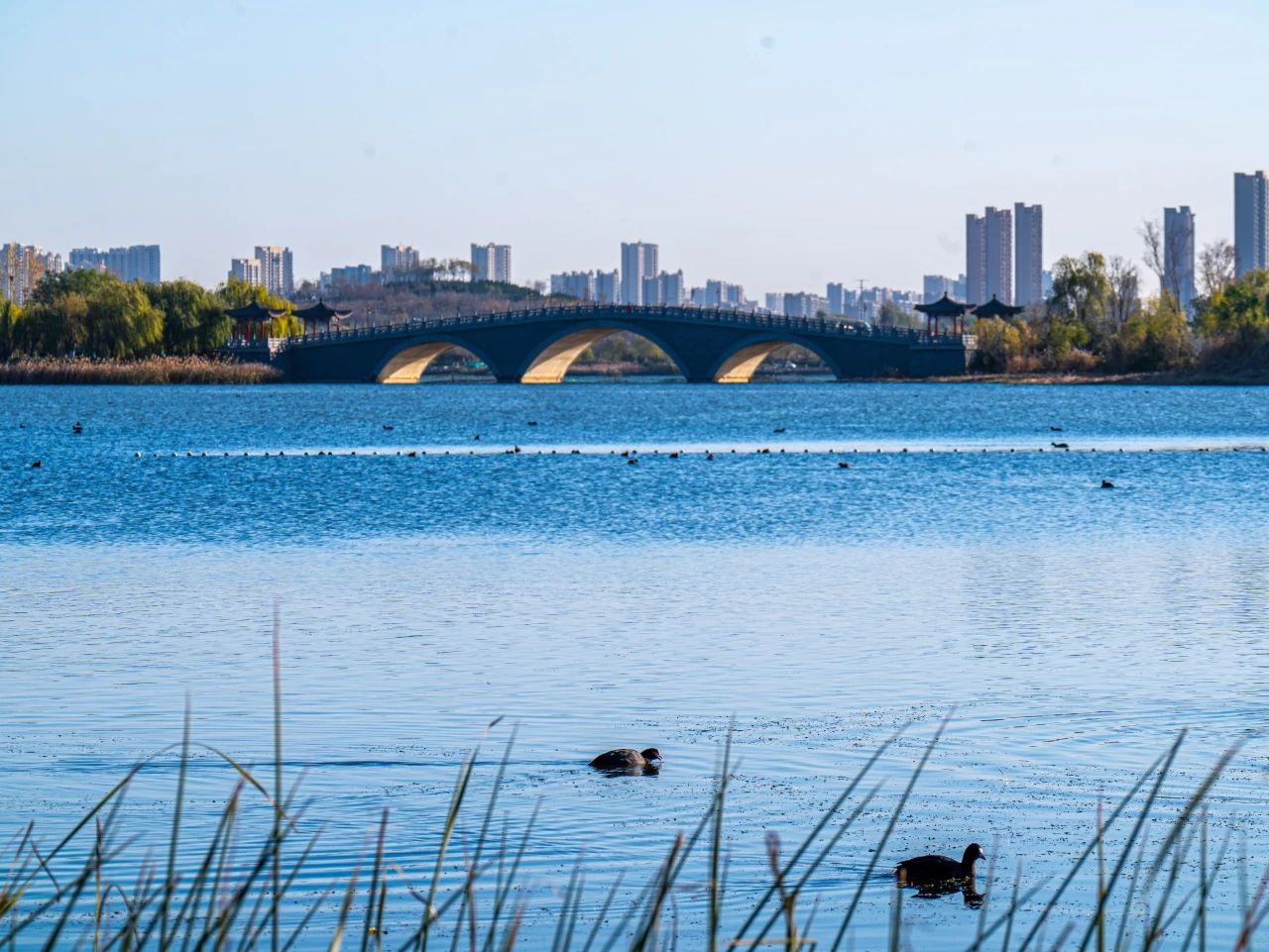 羽翼輕展映寒暉,群鳥嬉戲逐水歸。秋末冬初,上百只國家二級保護動物白骨頂雞如約來到濟南華山景區棲息,赴冬日的約定。