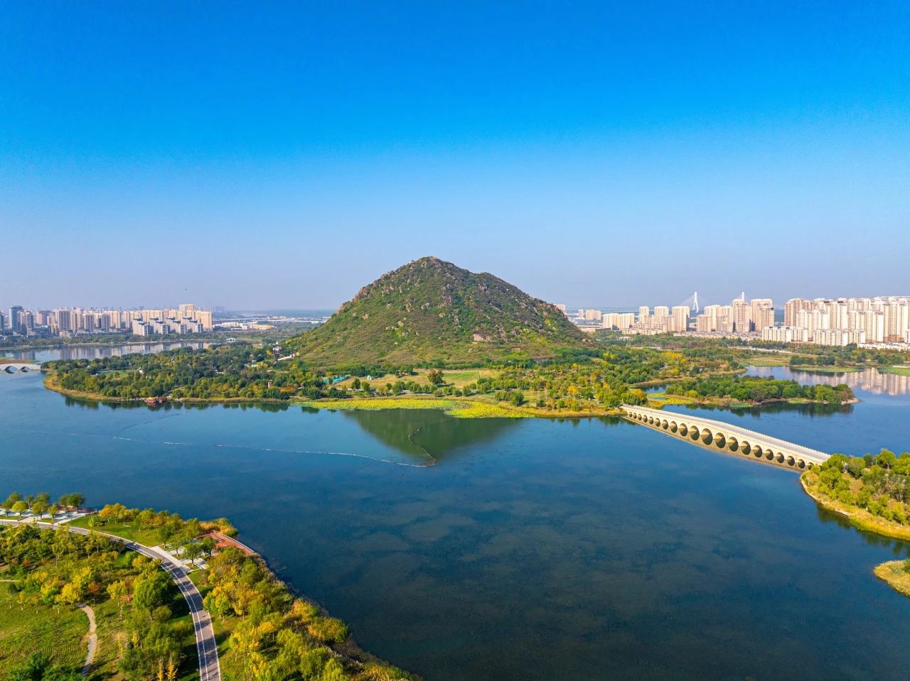 2013年以來,濟南持續整治建設華山片區,面積達6平方公里之多的華山歷史文化濕地公園建成納客。海拔197米的華不注山下,華陽宮莊嚴肅穆,環山湖泊水波蕩漾。一幅新時代的鵲華秋色畫卷徐徐展開。