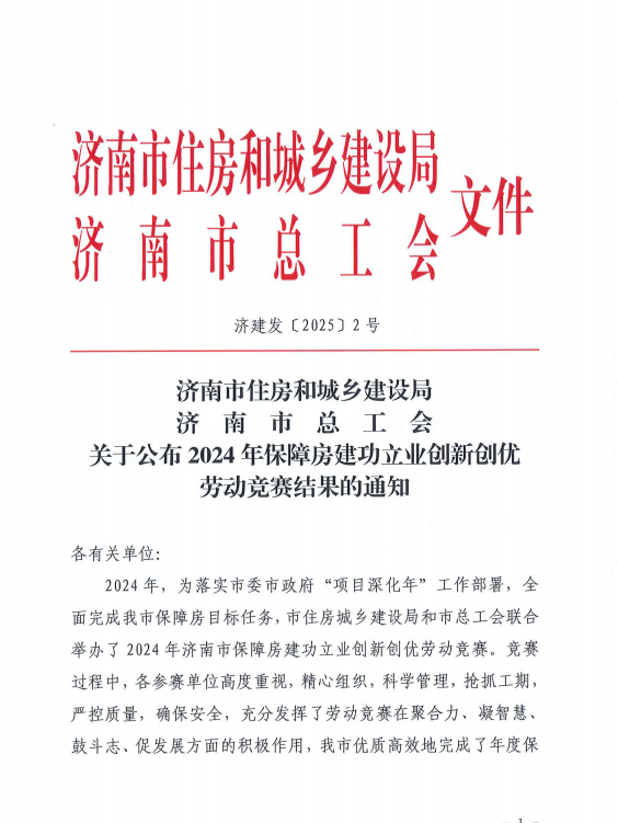 建設(shè)集團(tuán)在2024年濟(jì)南市保障房勞動競賽中榮獲多項(xiàng)榮譽(yù)