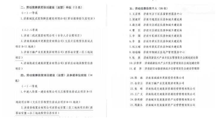 近日,濟(jì)南市住建局、市總工會公布2024年保障房建功立業(yè)創(chuàng)新創(chuàng)優(yōu)勞動競賽結(jié)果的通知,建設(shè)集團(tuán)所屬濟(jì)南萬融產(chǎn)業(yè)發(fā)展集團(tuán)有限公司榮獲項(xiàng)目建設(shè)(運(yùn)營)單位二等獎、公司職工金宗云獲評先進(jìn)個人,萬融集團(tuán)所屬濟(jì)南春曉置業(yè)有限公司西客站安置二區(qū)三地塊項(xiàng)目部榮獲項(xiàng)目建設(shè)(運(yùn)營)及參建單位班組一等獎。